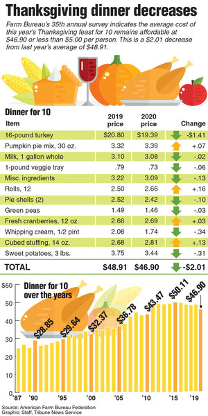 The average overall cost of a traditional Thanksgiving dinner for 10 this year is $46.90, down 4% from last year, according to the farm group's survey. The survey is based on a menu of turkey, stuffing, sweet potatoes, rolls with butter, peas, cranberries, a veggie tray, pumpkin pie with whipped cream, and coffee and milk.