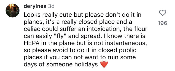 “Please don’t. I have celiacs and would have been very upset to have my entire long haul flight contaminated,” one of her detractors replied.