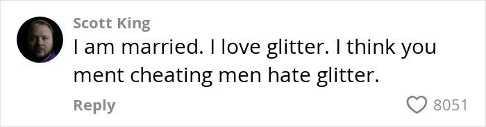 “Everyone hates glitter. But married guys will avoid contact with it. (Which is the point),” someone else pointed out.