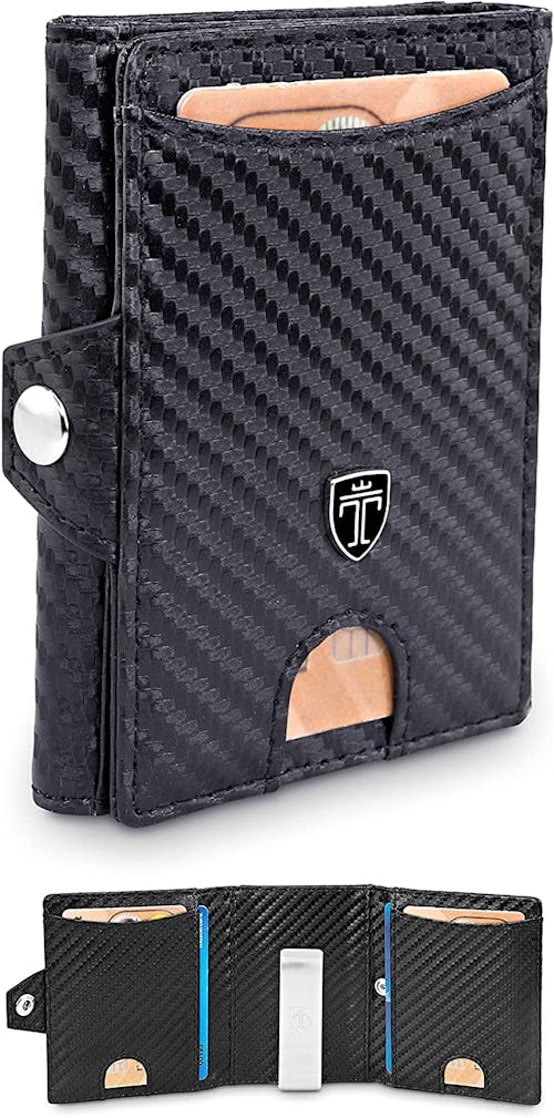 This trifold clutch comes with a wrist strap, allowing you to use it as a purse. With seven card slots, three transparent ID windows — two of which you can use to keep photos in — and two compartments for cash. Plus, there’s a zippered outer pocket. It’s made from faux leather that one Amazon reviewer described as “sturdy,” and the interior is protected with a zipper and RFID-blocking technology.
