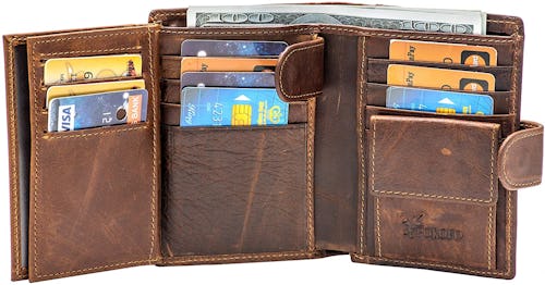 Measuring 5.25 by 4 inches and nearly 1 inch thick, this is a hefty leather wallet that’s made to accommodate all your essentials. While it might be too large to fit in some side pockets, multiple Amazon reviewers reported that it comfortably fit in their back pockets. It features a snap-closure pouch for loose change, as well as 14 slots for cards, three transparent sleeves for photos or IDs, two sections for cash, and a zippered pocket — and it also has RFID-blocking technology. A snap button on the outside keeps your items securely inside its leather shell.