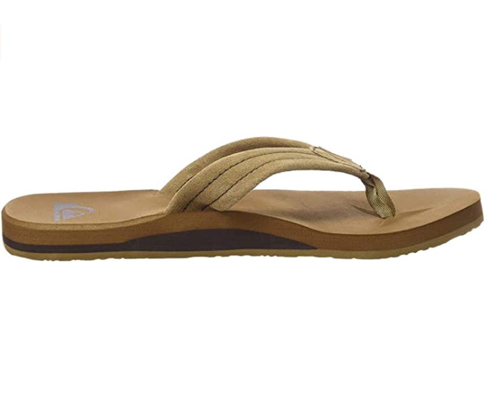 Made by the well-known surf-brand Quicksilver, these casual flip flops are perfect for everyday wear. They have double-stitched straps that are made with suede for a soft feel and secured with a durable nylon toe post. For added comfort, they also have an anatomically correct arch on the compression-molded EVA footbed that gives the whole shoe a more padded feel. These flip flops are finished with a rubber sole that has multi-angled logo lugs to give you better traction wherever you walk.