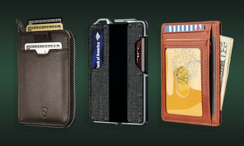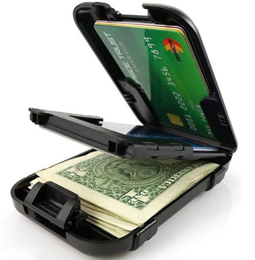 This polycarbonate and aluminum wallet is crack- and crush-resistant and locks shut. It also flips open with the push of a button. Inside, there are three card slots and a detachable money clip for additional bills or cards. In total, it can hold up to eight cards and 10 bills. It's a little thicker than most of the wallets on this list, but it should still fit comfortably in most pockets, according to reviewers. It has a scratch-resistant surface and is available in black, blue, orange, and gray.