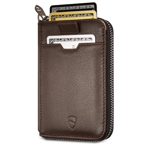 Inside this zip-up leather wallet, there’s a compartment for up to six cards, a strap for bills, and a small pocket for change. There are four additional card slots on the exterior with room for up to six cards, and a pull tab to reach your most used cards. The wallet also has a key ring that can be tucked inside it when not in use. Choose from four colors, including classic black and brown.