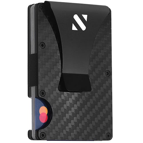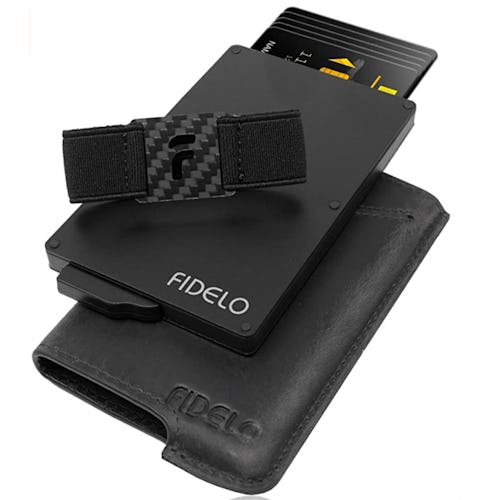 Made from sturdy carbon fiber and aluminum, this minimalist wallet will stand the test of time and expands to hold up to 12 cards. It also has a money clip that can secure up to nine bills. There’s a thumb cutout for sliding cards out quickly, and though the wallet is only available in black, you have eight choices for the logo color. The wallet has earned more than 2,800 five-star ratings.