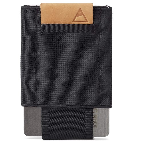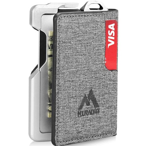 Made from faux leather and aluminum, this minimalist wallet has a carabiner tether for attaching the wallet to bags or keychains easily. The bifold wallet holds up to 12 cards and includes a translucent ID slot. There’s also a silicone cash band for bills. This wallet is available in 12 colors and styles, including one with a keychain.