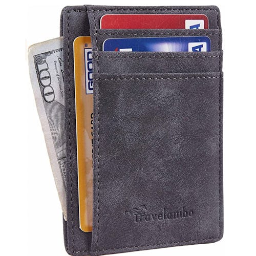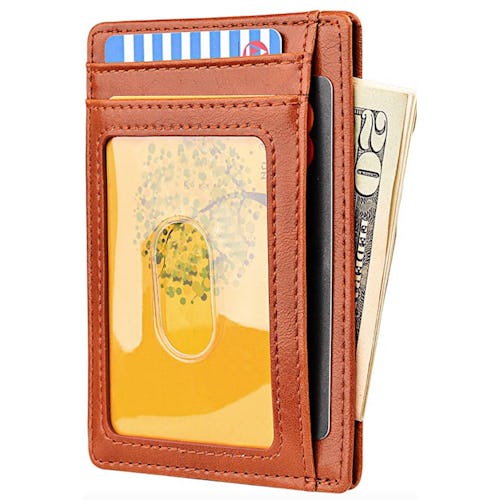 This leather wallet with a polyester lining has earned more than 50,000 positive ratings from Amazon shoppers and costs less than $20. It has eight slots, including a transparent pocket for storing your ID card. The wallet has a thumbhole for getting your most often used card out quickly. Plus, it’s available in 25 colors and styles.