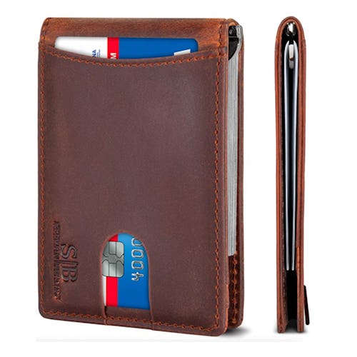 If you prefer a bifold style, this leather wallet lacks the bulk while still providing room for six to eight cards. It has a front pocket with a thumb hole for your most used card, and inside, there’s a transparent ID sleeve, two card slots, and a stainless steel money clip. The wallet also has an interior pull strap where you can store three to four cards. There are 12 colors and styles to choose from, and the wallet has earned an overall 4.7-star rating on Amazon after more than 24,000 reviews.