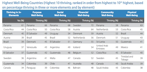 The U.S. did not perform all that well, ending up in 12th place. While it ranked high in the purpose and social components, in other areas it "does not stand out. The percentage of American adults who are suffering in physical and community well-being is comparable to global levels," the report found.