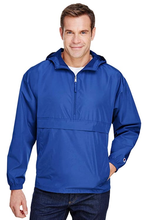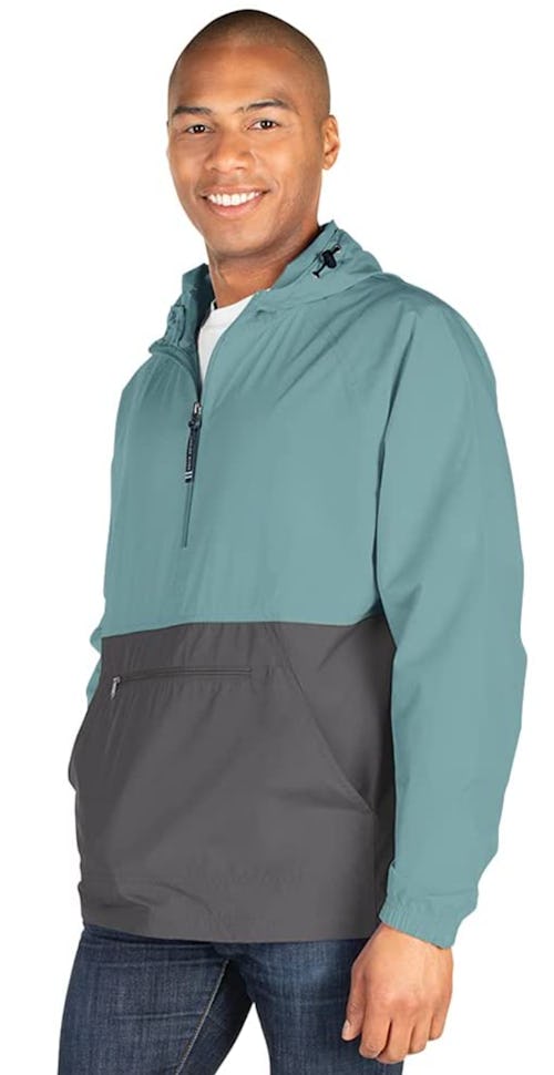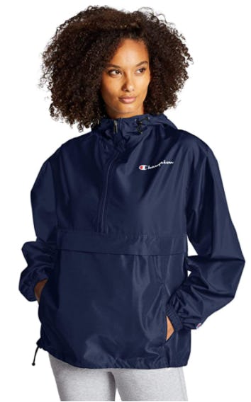 With more than 5,000 five-star ratings, this color-blocked windbreaker by Charles River Apparel is a fan-favorite on Amazon. It’s unlined and made of 100% polyester for effective wind and water resistance. There’s an adjustable shock cord at the hood and a quarter-length zipper so you can easily adjust the fit. For portability, a large, zippered front pocket converts into a storage pouch for the jacket. Many reviewers recommended ordering two sizes down if you’re on the petite side.