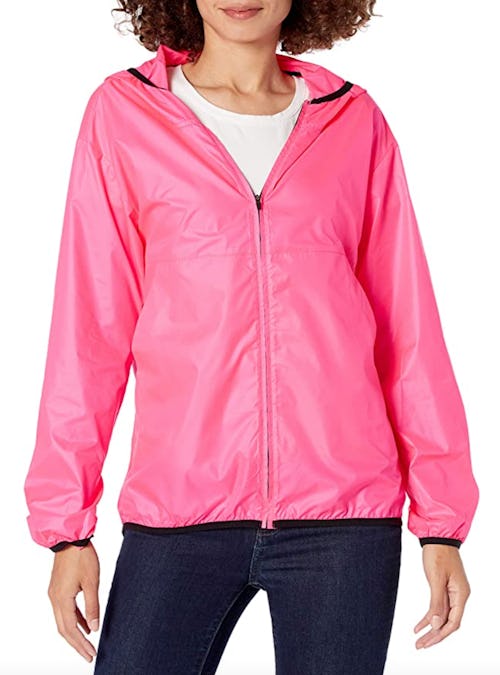 The women’s version of the Amazon Essentials windbreaker is made with 100% polyester to keep you protected from wind and rain. There's a full zipper for easy wear and a hood with elastic trim to stay in place on your head. The windbreaker has large front pockets as well as a back pocket for folding and storing the jacket after use. Some reviewers noted that you may want to order a size up if you plan to layer this over thick clothes or if you just prefer a loose fit.