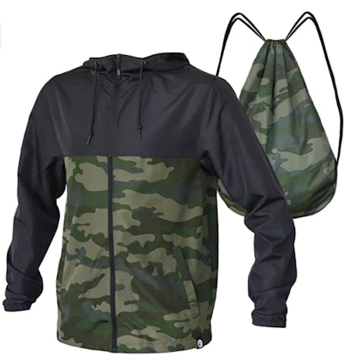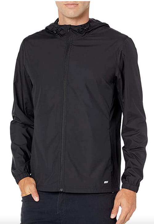 This basic windbreaker by Amazon Essentials is designed for the minimalist. Made of 100% polyester, it has a full zipper and low-profile side pockets. The hood can be adjusted with a drawcord and a back zippered pocket doubles as storage for the jacket.