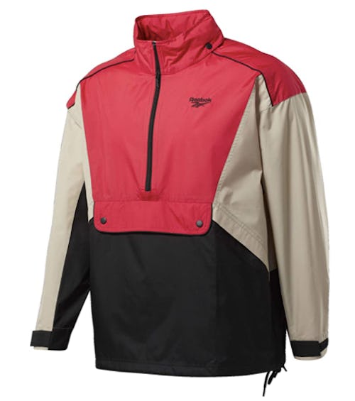 Reebok's classic trail jacket comes in two color block options for a retro look that works just as well on the streets as it would on a bike or hiking path. It's made of 100% polyester and has a half zipper for a pull-over style. The hood can be adjusted with drawstrings or hidden inside a stand-up collar when it's not needed. There are side pockets for your hands as well as a large front pouch with snap buttons. A relaxed fit make it easy to slip on over layers on a chilly day.
