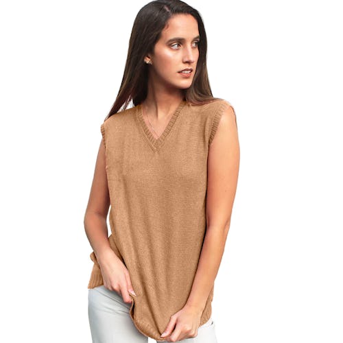 Stylish on its own or layered over another top, this sweater vest is extremely versatile. It’s made in Peru using a blend of 70% alpaca and 30% sheep’s wool. The V-neck sweater has an oversize fit and a ribbed hem and collar, and it’s available in a wide range of sizes and colors, including camel, black, and coastal blue.
