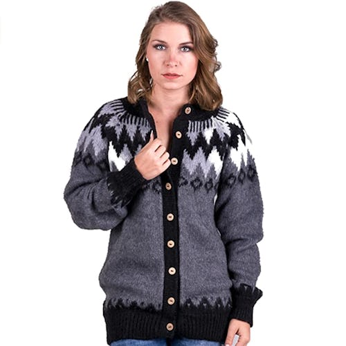 Made from a blend of 70% baby alpaca wool and 30% acrylic, this cardigan sweater is extra cozy. Baby alpaca (which generally refers to the grade of fiber, not the age of the animal) is especially soft, and one reviewer called the sweater “comfy and well made.” The gray-toned cardigan is handmade in Peru and has long sleeves and a button closure, making it great for layering.