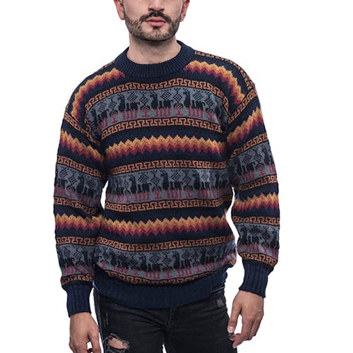 Woven from a mix of alpaca and sheep wool, this round-neck sweater has a classic pullover style and “great warmth without bulk,” according to one reviewer. It also has wide, ribbed cuffs for maximum comfort. Designed in Peru, the colorful sweater features geometric and llama patterns, and it has a fun retro vibe.