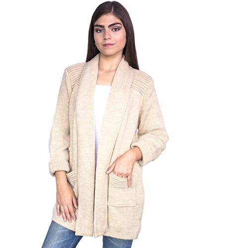 This open cardigan is made from 100% alpaca wool and has a relaxed fit that’s great for layering. The soft sweater has ruched detailing at the shoulders and pockets, and the sleeves look great cuffed if you want less length. The cardigan also comes in a range of colors, including neutral beige, bright yellow, and gray.