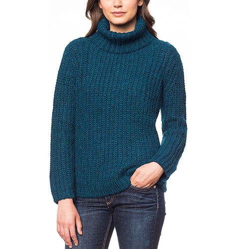 This turtleneck sweater is made from 100% baby alpaca wool that’s soft and lightweight. The sweater features a chunky knit and wide collar that are cozy without feeling too bulky, and it has a slouchy fit that is easy to pair with jeans, dress pants, and skirts. Choose from blue-green, white, and burgundy.