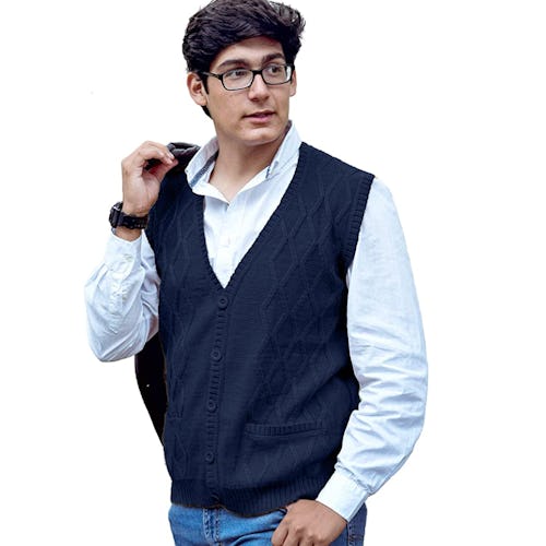 The classic argyle pattern of this sweater vest adds texture and timeless style. It’s made in Peru from a blend of 70% alpaca and 30% sheep’s wool, and it features color-matching buttons for a more seamless look. It has two pockets and a relaxed fit, and as one Amazon reviewer wrote, it’s “stretchy enough to ‘move with me’ when reaching up.”