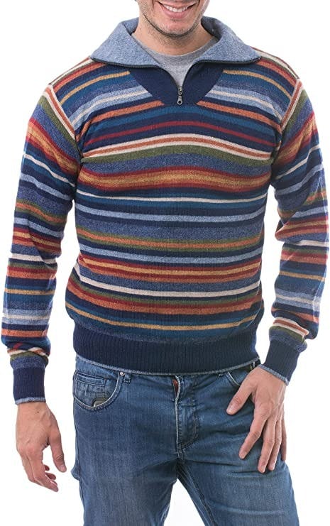 If stripes are more your style, this pullover sweater is a great option that’s made in Peru using 100% alpaca wool. It has a zip-up mock turtleneck, comes in a steel blue colorway, and is suitable for when you want to look polished while staying warm.