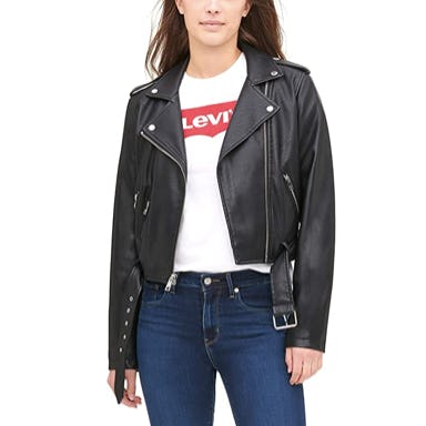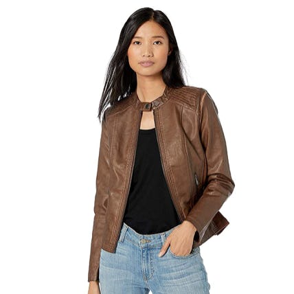 For a more casual style than a motorcycle jacket, this faux leather jacket is a solid pick. It has two zippered side pockets, a zipper closure, and a snap across the collar for a lightweight, streamlined look. And for extra stretch, there are knit panels on the sides that one reviewer reported “makes it super comfortable especially when sitting and driving,” and another adds, “not like other tight/stiff leather jackets.” It’s available in a variety of colors, from classic black to bright yellow, and reviewers report they fit true to size. Plus, the jacket is machine washable.