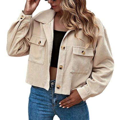 This cropped, corduroy jacket is lightweight, breezy, and has a slightly cropped length. With a relaxed fit and three buttons in the front, it’s great to pair with high-waisted pants or a dress without looking bulky. It’s available in a wide range of sizes and colors, plus some cozier-looking plaids. The jacket is machine washable, and several reviewers report that it looks just like the pictures.
