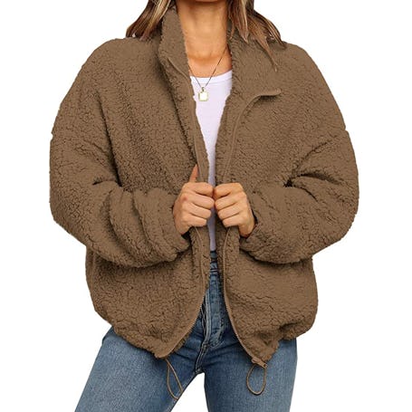 Despite its cuddly and cozy feel, this oversize faux shearling jacket is still lightweight and great for transitional seasons — plus, there are 35 colors to choose from and double-breasted style options. It has a zipper closure, two deep side pockets, and elastic cuffs and hem. And with over 15,000 five-star reviews, this jacket is a fan favorite on Amazon. Reviewers recommend machine washing the jacket in cold water and laying it flat to dry.