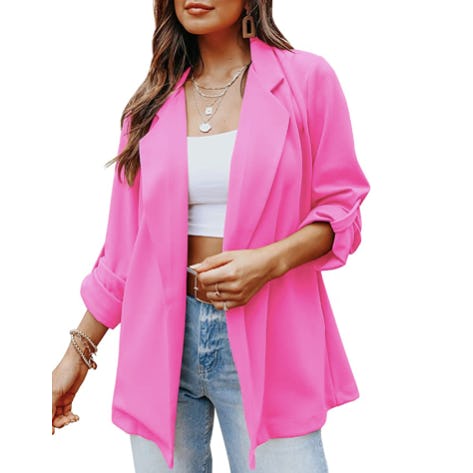 One reviewer wrote: “Loved this hot pink blazer so much I bought it in white! Great for summer business meetings or to throw on with a cute outfit for dinner. Very lightweight and easy for hot weather / AC indoors. Looks really quality and I got a ton of compliments!”