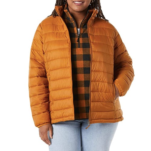 When you want a jacket that will give you some warmth but won’t weigh you down, this Amazon Essentials puffer jacket is a great pick. It has a water-resistant nylon shell and a lightweight polyester fill, plus it’s available in over a dozen colors. There’s a stand-up collar, zippered pockets, zippered front, and elastic cuffs to keep out cold and wind, and it’s machine washable. You can get the jacket in a wide range of sizes, and reviewers report that it remains true to size. And if you’re traveling, the whole jacket can be folded into the included pouch.