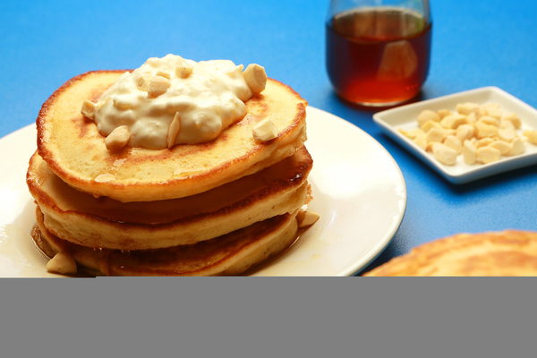 First, the pancakes are topped with pineapple syrup, which is just the juice from a can of crushed pineapples that is boiled together with maple syrup; the fruit adds a light, refreshing boost to the syrup. And then the crushed pineapple itself is blended into a cup of sour cream.