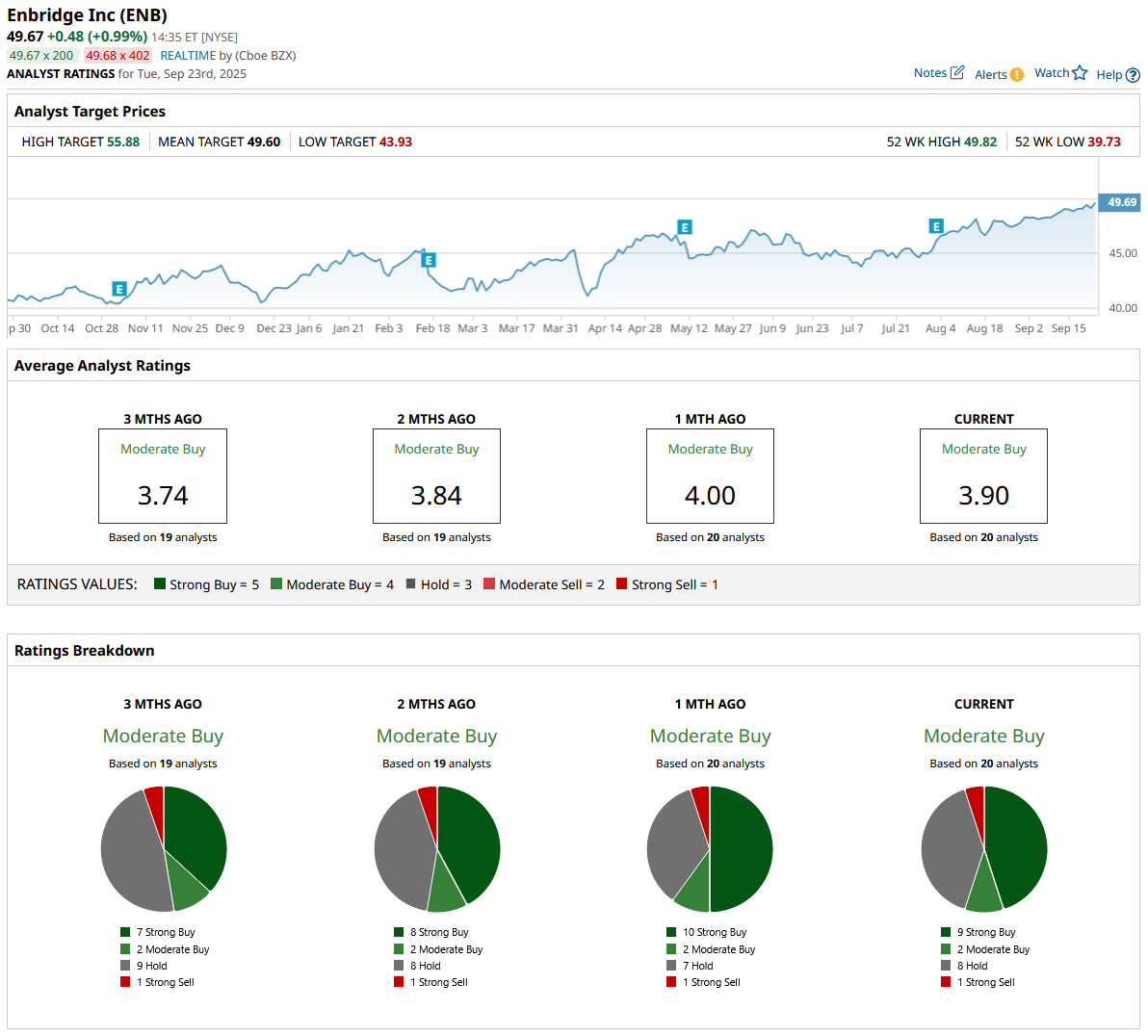 Overall, Wall Street rates ENB stock a “Moderate Buy.” Of the 20 analysts in coverage, nine recommend a “Strong Buy,” two rate it a “Moderate Buy,” eight say it's a “Hold,” and one rates it a “Strong Sell.” ENB stock is trading close to its average analyst target price of $49.60. Its Street-high price estimate of $55.88 implies an upside potential of 13.6% from current levels.