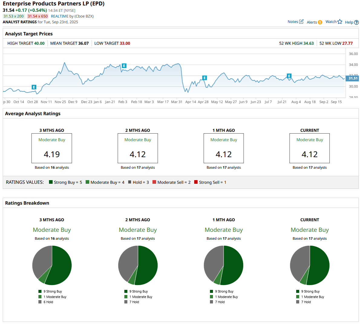 Overall, Wall Street rates EPD stock a “Moderate Buy.” Out of the 17 analysts who cover EPD, nine recommend a “Strong Buy,” one rates it a “Moderate Buy,” and seven recommend a “Hold.” The average analyst price target of $36.07 represents a potential 15% increase from current levels. Its high target price of $40 suggests the stock could climb by another 27.5% over the next 12 months.