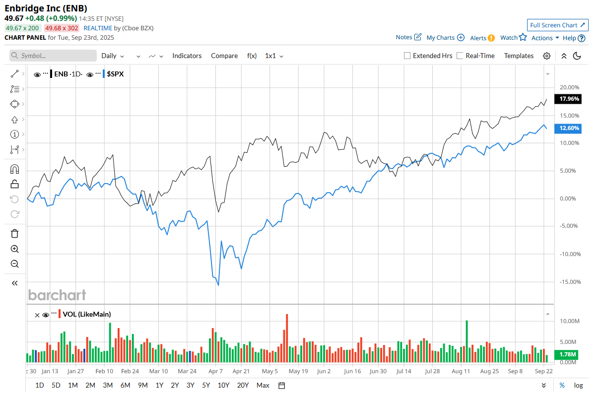 Valued at $148.3 billion, Enbridge operates critical energy infrastructure across North America, and its diversified portfolio spans pipelines, storage, utilities, and renewables. ENB stock has gained 17% YTD, compared to the overall market.