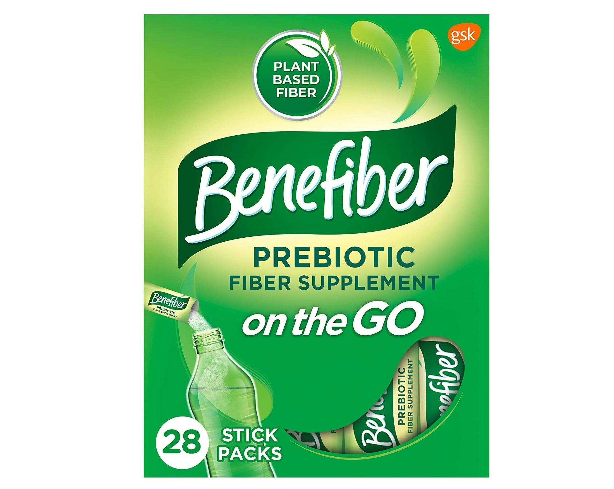 If portability is key, Dr. Sonpal recommends the Benefiber On the Go prebiotic fiber supplement. It contains both prebiotics to feed beneficial bacteria and plant-based wheat dextrin soluble fiber to promote digestive regularity. Most importantly, though, it comes in individual, single-serve packets, and it's unflavored, clear, and easy to dissolve in most drinks — so you can get your daily intake when you're traveling, at work, or on the road. In addition to being sugar free and gluten free, Dr. Sonpal also notes that "it also has no artificial flavors and provides constipation relief."