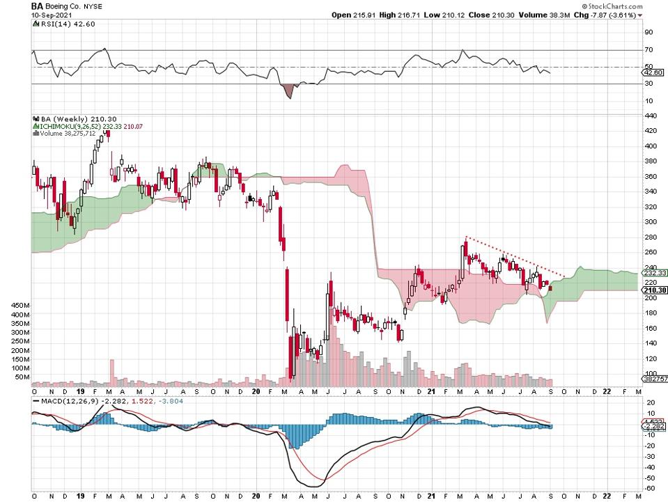 The stock never made it back to the 2019 all time high up there above 420. Even the big buying blast for the markets coming off of the March, 2020 pandemic low couldn’t do it. Now, Boeing is unable to rise above this year’s March high of 280. This action is quite different than that of the most talked about Dow components.