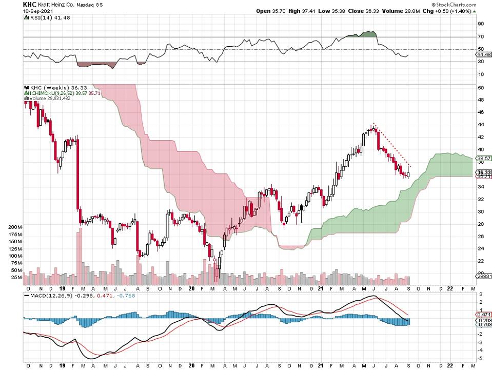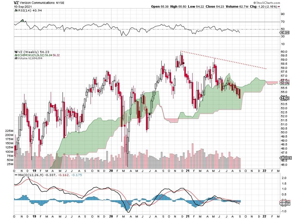 You can see the powerful move from the March, 2020 low of 46 to the November, 2020 high of about 60. It’s been unable to move higher than that since then. Verizon is another well-known Dow component that’s steadily declined during this summer while Apple and Microsoft kept grabbing the attention with the “all time highs” headlines.