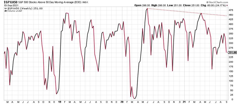 Take a look at the percentage of stocks in the S&P now trading above their 50-day moving averages: