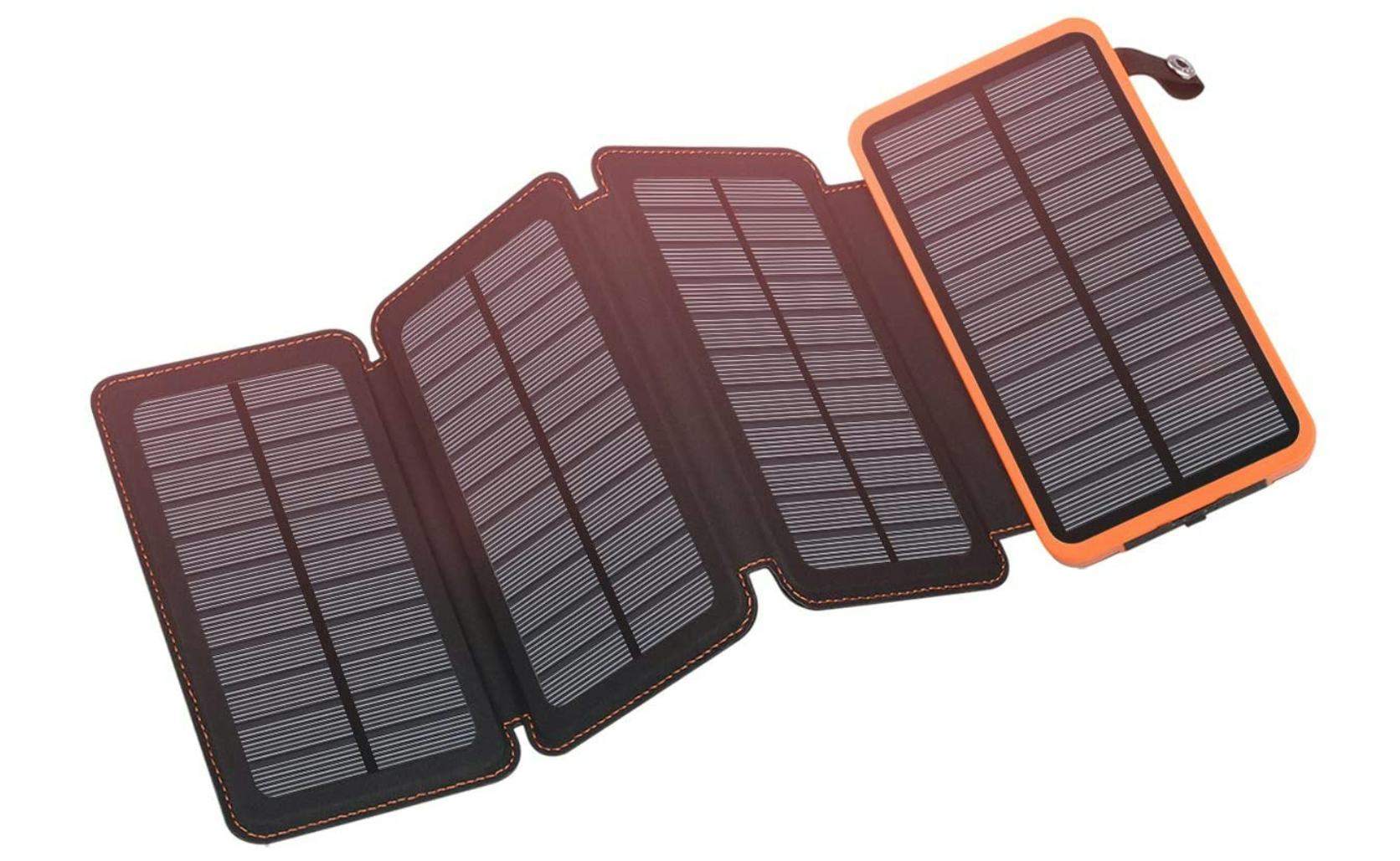 If you need more power but you still want portability, this mid-sized solar panel is the perfect choice. The four panels are highly efficient and can convert up to 23.5% of solar power into energy in good conditions, which can then be distributed to your devices via three USB ports and an attached micro-USB cord, which is compatible with select Apple and Android devices. Because this solar panel does not have a power bank, it can only charge devices while in the sun, but the reinforced holes make it easy to attach to your bag for charging on the move. It also has a cover to help protect it from water and dust and has an IPX4 water-resistance rating.