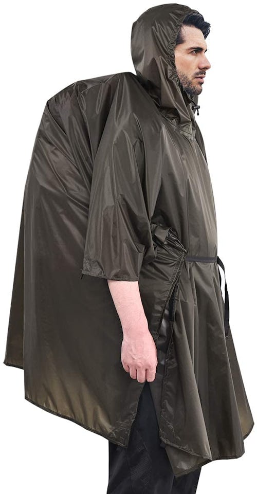Although a few ponchos on this list can convert into shelters, the Anyoo rain poncho is best equipped to do so, featuring eyelets on its bottom corners for a secure tarp or groundsheet setup. It’s made of 210-denier ripstop polyester treated with PVC and PU coatings, and the waterproofness is rated at 3,000 millimeters. However, it still just weighs 9 ounces in its included stuff sack. The poncho is well-ventilated, with open sides and snap closures, and it has an adjustable hood with a small brim to keep rain out of your eyes. While it can be worn over backpacks, it’s likely best for small ones — one Amazon commenter noted that “it will get pretty short in the back covering a pack.”
