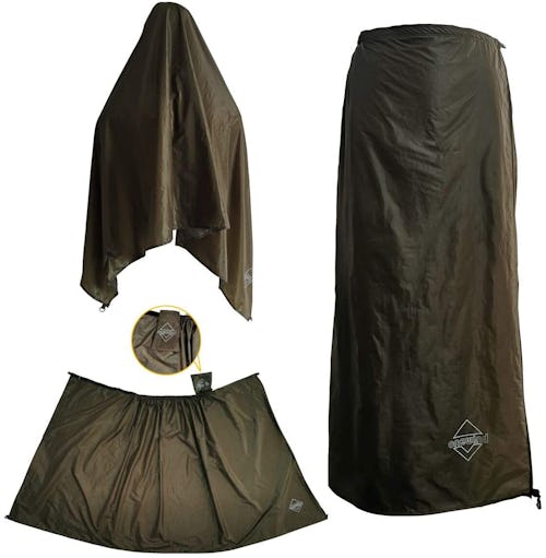One reviewer wrote: “Used this on the Sierra High Route. SO much better than rain pants. You can stay warm in the cold rain with these puppies, as the overlap allows for some ventilation as not to overheat + sweat. Also protects against mosquitos when you are sitting down (you can just drape this over your legs while you eat or w.e.) This also doubles as a pack cover. Drape this over your entire pack and wear it like a cape around your neck, it really works!”