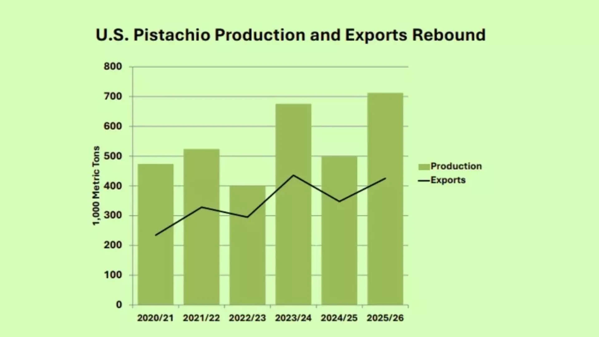 According to USDA Data from February 2026, American exports of pistachios are expected to rebound by over 20% this year to a near-record 425,000 tons. Moreover, reduced outputs from Iran, Türkey, and Syria are expected to stimulate US shipments to top markets in Asia and Europe.