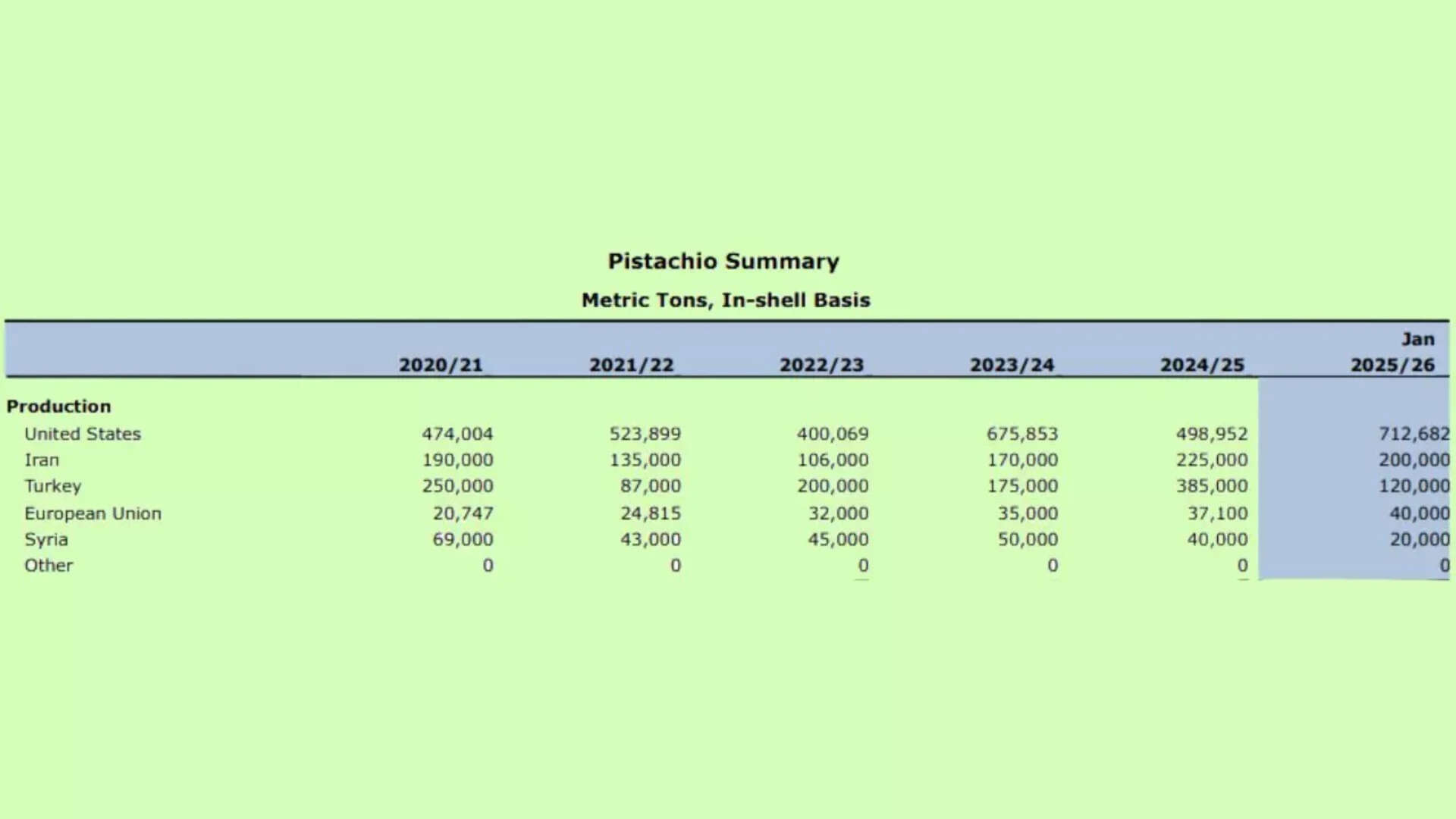 • US: Centred in California’s San Joaquin Valley, the U.S. has transformed from a minor player in the 1970s to the world’s leading producer. In the 2025/26 season, U.S. production hit a record 712,000 metric tons, accounting for roughly 65% of global output.