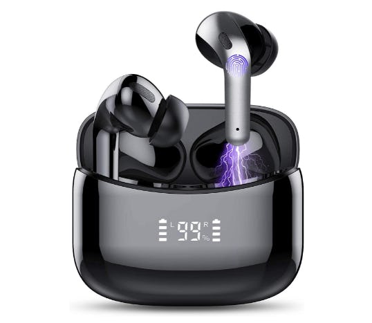 These Bluetooth earbuds boast several features that make them a steal at under $30. They come in a rechargeable case with an LED display that shows how much power is left in each headphone and the case itself, so it’s easy to check battery life at a glance. The earbuds offer up to seven hours of music on one charge, and a fully charged case can extend that time to 35 hours of total listening. These earbuds are truly wireless, pair quickly with your devices, and come with touch sensors on each bud so you can adjust the volume, pick up phone calls, or skip to the next track with a simple touch. They also have an IPX7 waterproof rating to withstand water up to 3 feet, so they’ll be resistant to rain and sweat.