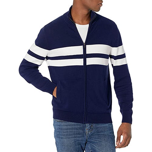 This full-zip cardigan makes for an upscale sporty jacket but in an affordable, easy-to-care-for package. It's made from 100% cotton that's machine-washable and feels as comfortable as a well-worn tee. This cardigan features a mock-neck ribbed collar and two welt pockets for your hands. "A soft non-itchy cotton front full zip sweater with lots of color choices, reasonable quality and thickness, and a decent price," one reviewer commented. For a toasty full-zip option, check out this flannel lined cardigan.