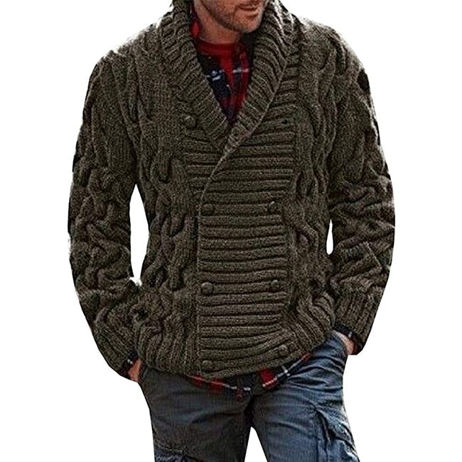 This cable knit double-breasted cardigan pairs the tailored button-front style of a blazer with a chunky cable knit for a sweater that looks incredibly nice at a budget-friendly price. It's woven from acrylic and a bit of cotton, with matching buttons and a shawl collar. Since care instructions aren't indicated, you may want to hand wash or hedge bets on a delicate machine cycle. Either way, it looks good with boots and jeans or a pair of chinos.