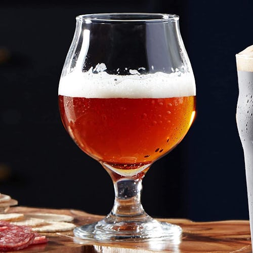 Tulip glasses are great at bringing out the flavors of Belgian ales, but they’re also a solid choice for strong beers like double IPAs. One reviewer confirmed that the glasses are “quality, inexpensive, [and] perfect for a double IPA and high alcohol content ales.” Each 16-ounce glass features a tulip-shaped bowl so you get the aromas with smooth sides (not nucleated or ridged). They’re machine washable, and users have described them as sturdy. Snag them as single glasses or a four-pack.