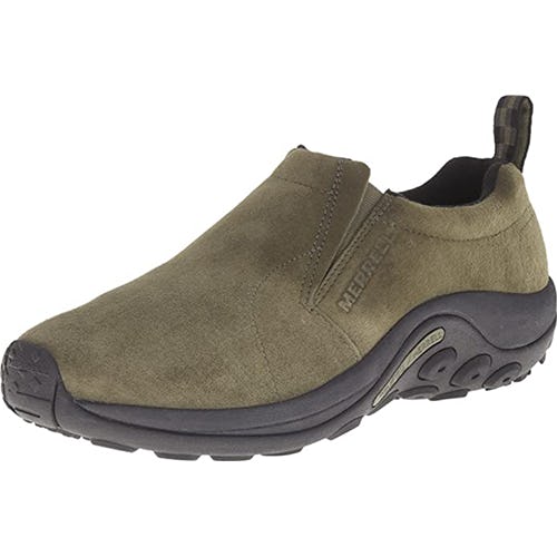 The Merrell Jungle Moc combines trail-worthy features with an unassuming appearance for a versatile, good-looking shoe that can take a beating. Its suede upper tops a 3-millimeter lug sole for traction on rugged terrain, with a nylon shank through the mid-foot for impressively good arch support and stability in a slip-on style. The air cushioning under the heel cuts weight for light yet powerful shock absorption, and the sole curves up high to cup your entire foot. Inside is a breathable mesh lining with odor-control tech and molded EVA foam for more cushioning.