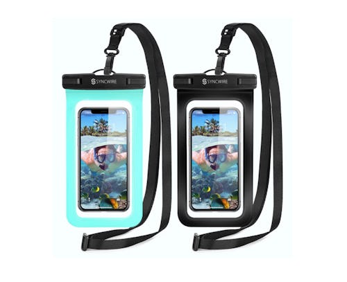 The Syncwire Waterproof Phone Pouch is a simple and universal waterproof case that fits phones up to seven inches long. This pouch is waterproof up to 100 feet, and features a quick snap and clip closure for easy insertion and removal. There's an adjustable lanyard that can hang around your neck or across your chest for a secure hold. The best thing about this case is that it floats, protecting you from losing your phone if you drop it.