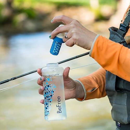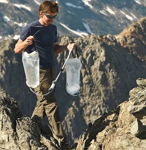 The details: With a solid 4.6-star rating on Amazon after 3,000-plus reviews, this hand pump from Survivor Filter is well-liked on the site because its small size (3.15 by 1.97 by 6.5 inches, to be exact) and light weight (around 8 ounces) make it easy to carry on all of your outdoor adventures. Pump water directly from a water source into any drinking vessel or into the included drinking cup, and the membrane filter with 0.1-micron pores will remove viruses, bacteria, and parasites (it will last for up to 100,000 liters before you need to replace it). This option also has a carbon filter (which will last for up to 2,000 liters before you need to buy a replacement) to help to improve the overall taste and smell of your water. It can filter 17 ounces of water per minute, and when you’re done filtering, you can utilize the included carrying case to corral all of the different pieces. This hand pump boasts a lifetime warranty.