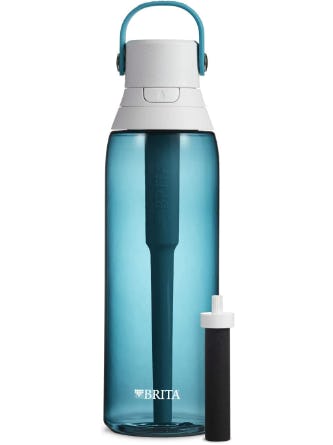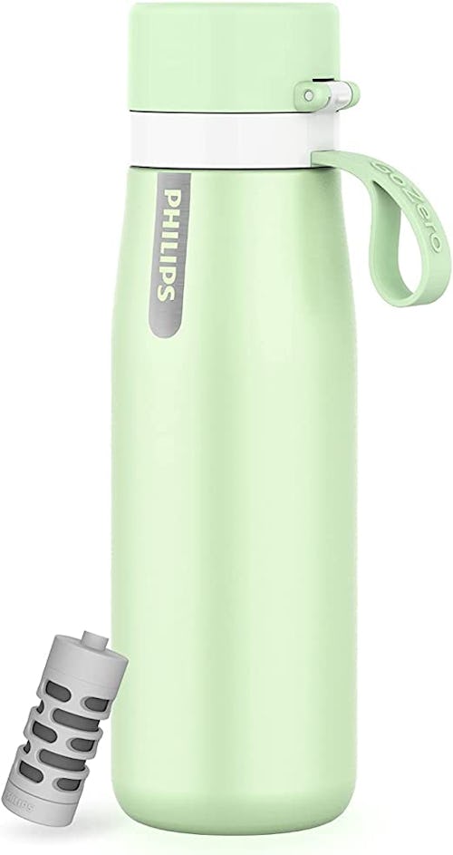 Made by the reputable appliance brand, this filtered water bottle uses an activated carbon fiber filter to reduce chlorine and particulates from tap water. The filter lasts for up to two months (40 gallons) before needing to be replaced, and the bottle’s insulated stainless steel construction can keep fluids cold for up to 24 hours. It features a spill and dust-proof cap with a pop-up button, a soft silicone mouthpiece, and a carrying loop for easy transportation. Also great: The brand offers a one-year replacement warranty if anything should break.